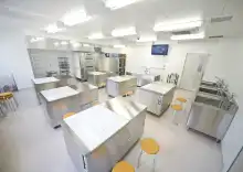 電気オーブンやスチームコンベクションを備え、主に洋菓子づくりを行う実習室です。ドイツ製の天井換気システムを採用しています。