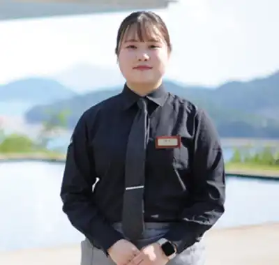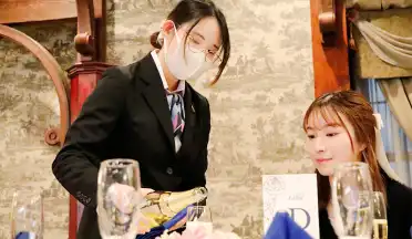 私はブライダルの道に進もうとアナブキに入学しましたが、現在はホテル内のレストランで接客業をしています。ホテルとブライダルの両方を学んだことで選択肢が広がりました。また検定もたくさん取得することができ、お皿の持ち方や接客用語など基礎的なことはもちろん、ワインについても学ぶことができました。一つのことを学ぶことも大切だと思いますが、色々なことを学び知識を身につけていると、いつか役に立つときがあります。この業界で働く上で、お客様全員に同じサービスを行っても皆様に満足はいただけません。お客様一人ひとりにあった接客ができるように心がけています。