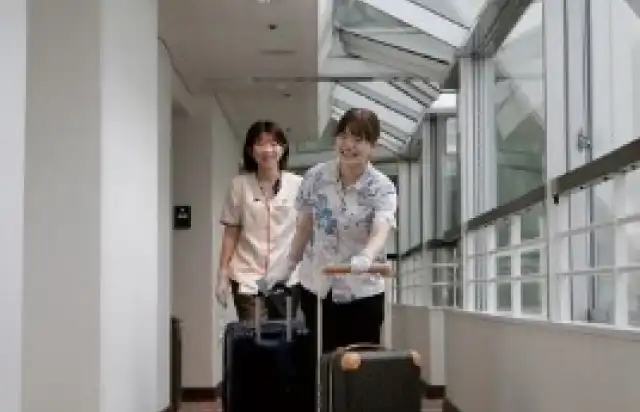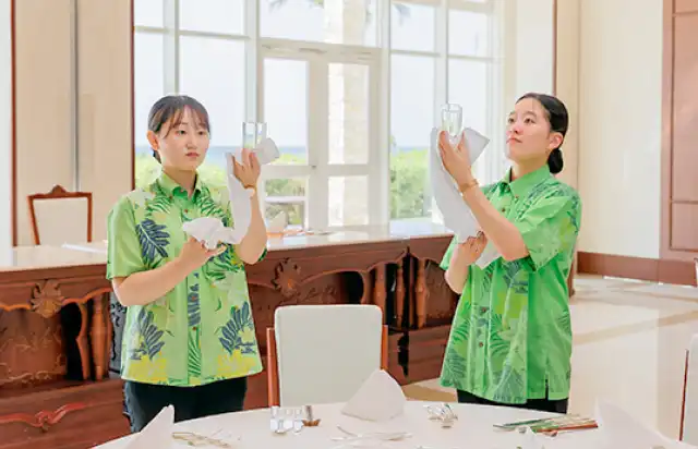 沖縄のリゾートホテルで実践学習。フロント・宿泊部・飲料部を経験します。実際の現場で働くことで即戦力の人材として必要なスキルを身につけます。
