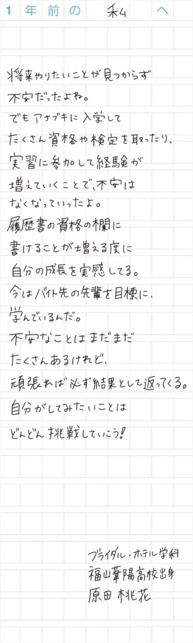 入学前に抱く不安を当時の自分に向けた「手紙」という形で、在学生よりみなさんへメッセージ。