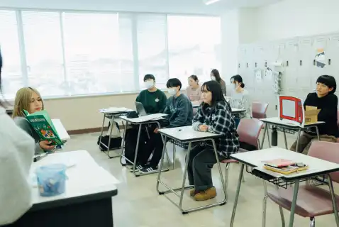 授業の合間の休憩時間にはみんなで集まっておしゃべり。授業の話をしたりたわいもない話で盛り上がったり…エレベーター横の階段はお気に入りの場所です。