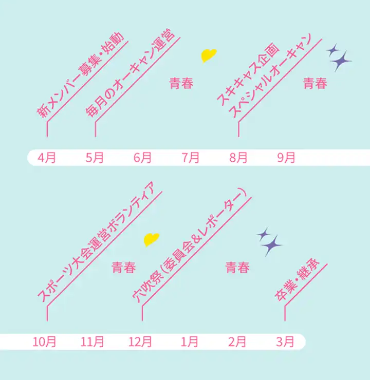 新入生歓迎パーティ(フレンドシップパーティ)の運営サポートや、穴吹祭の校門飾り付け、クリスマスツリーの装飾など、季節のイベントも全力で演出。