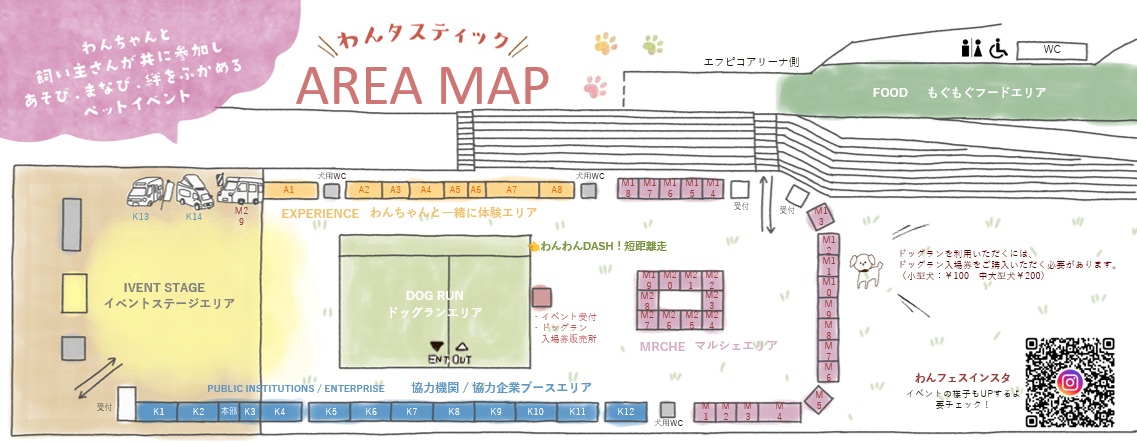 - 会場の芦田川かわまち広場は不特定多数の方が利用する公共の場所のため、わんちゃんの排泄処理を適切に行ってください。マナーベルト、マナーパンツの使用にご協力をお願い致します。また、会場内にワンちゃん専用のトイレを複数設置していますのでご利用ください。