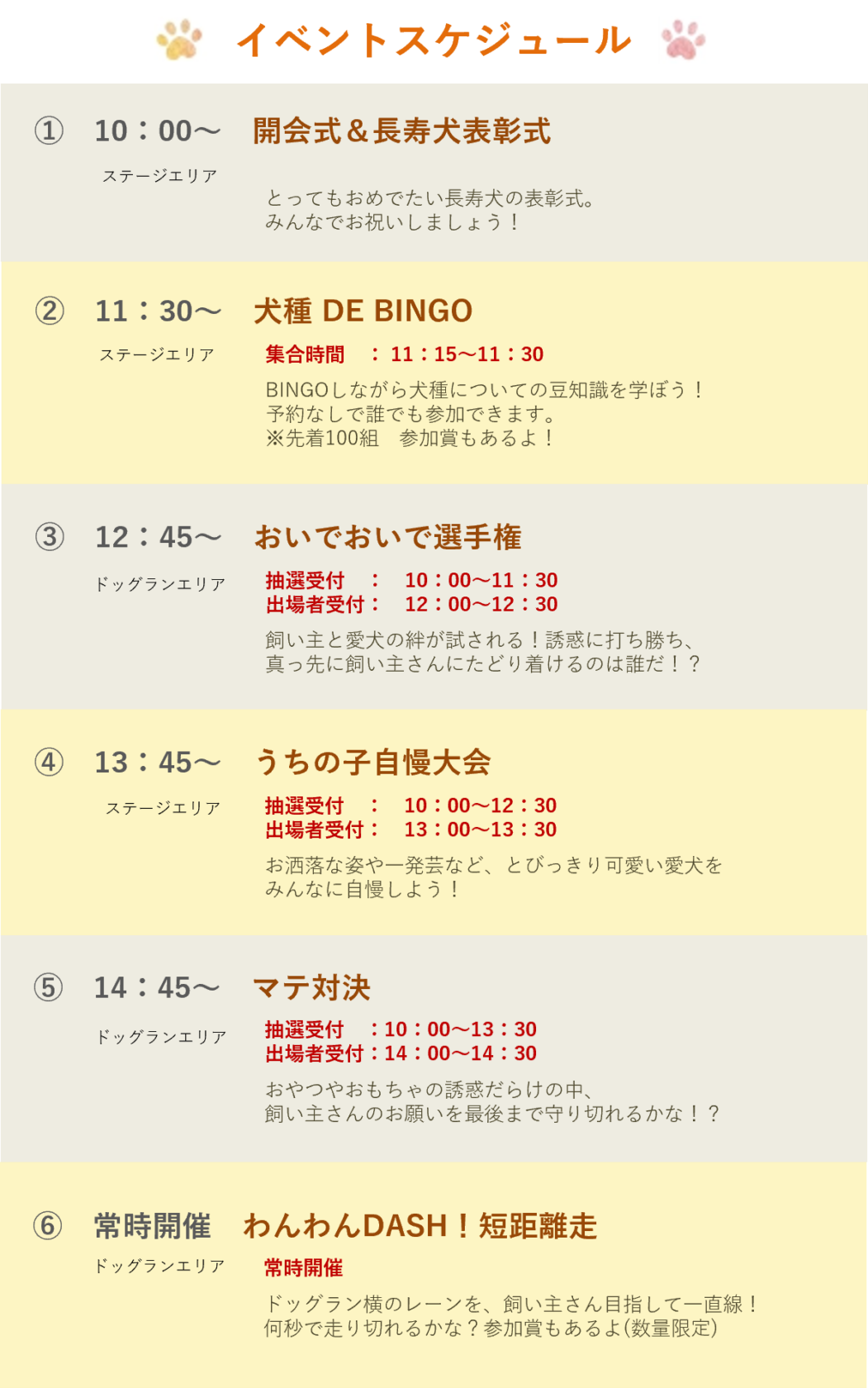 わんちゃんと一緒に参加できるメインイベントのタイムスケジュールです。参加方法や注意事項は後述の「メインイベント」を参照ください。