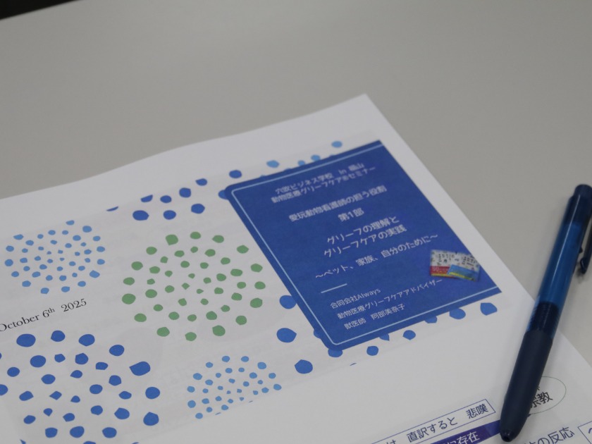 「グリーフケアに対して、今までは動物を見て、あるいは失った飼い主が感じる悲しみに対するケアのみだと思っていた。しかし、自分自身が感じるグリーフケアをしなければ相手のグリーフケアをすることはできないことまで考えていなかったので、目から鱗でした」