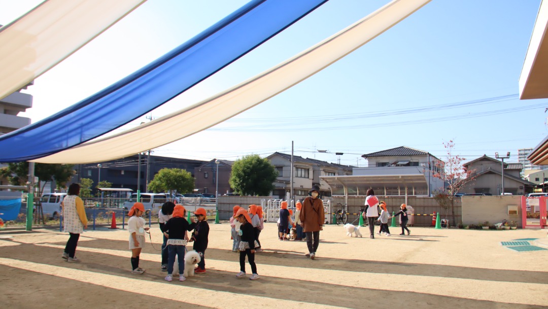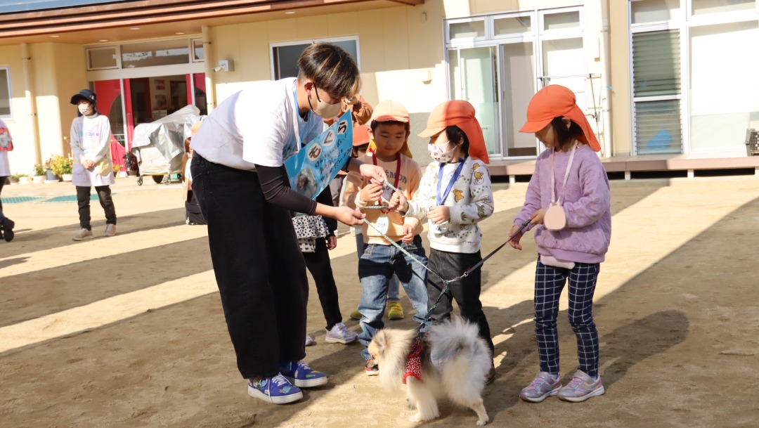 学生のサポートのおかげで、子どもたちはわんちゃんを撫でて嬉しそうな表情を浮かべたり、一緒にお散歩体験を楽しんだりと、園庭には穏やかで幸せな空気が流れていました。