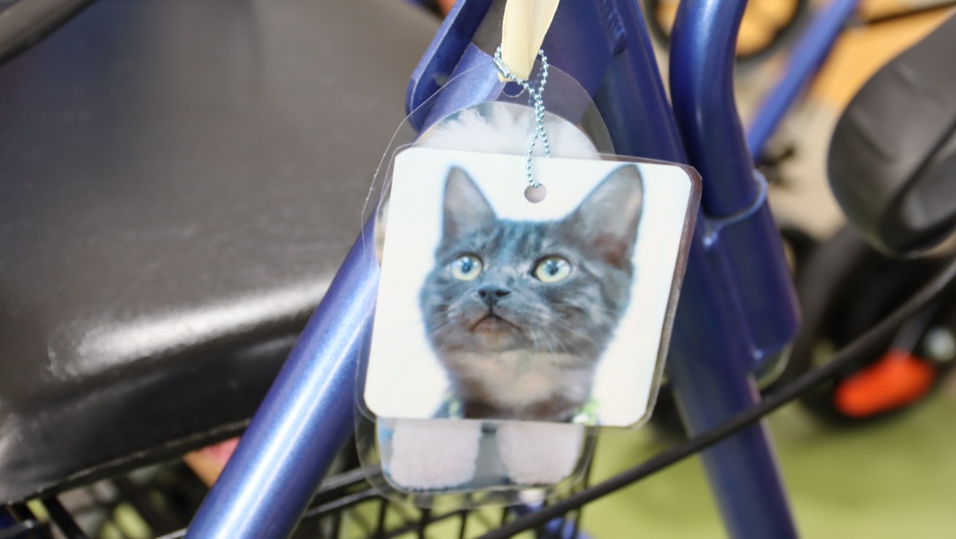 ふと利用者さんの車椅子を見ると、以前の訪問で学生たちがプレゼントした「スタッフ犬・猫のキーホルダー」がいくつも飾られていました。