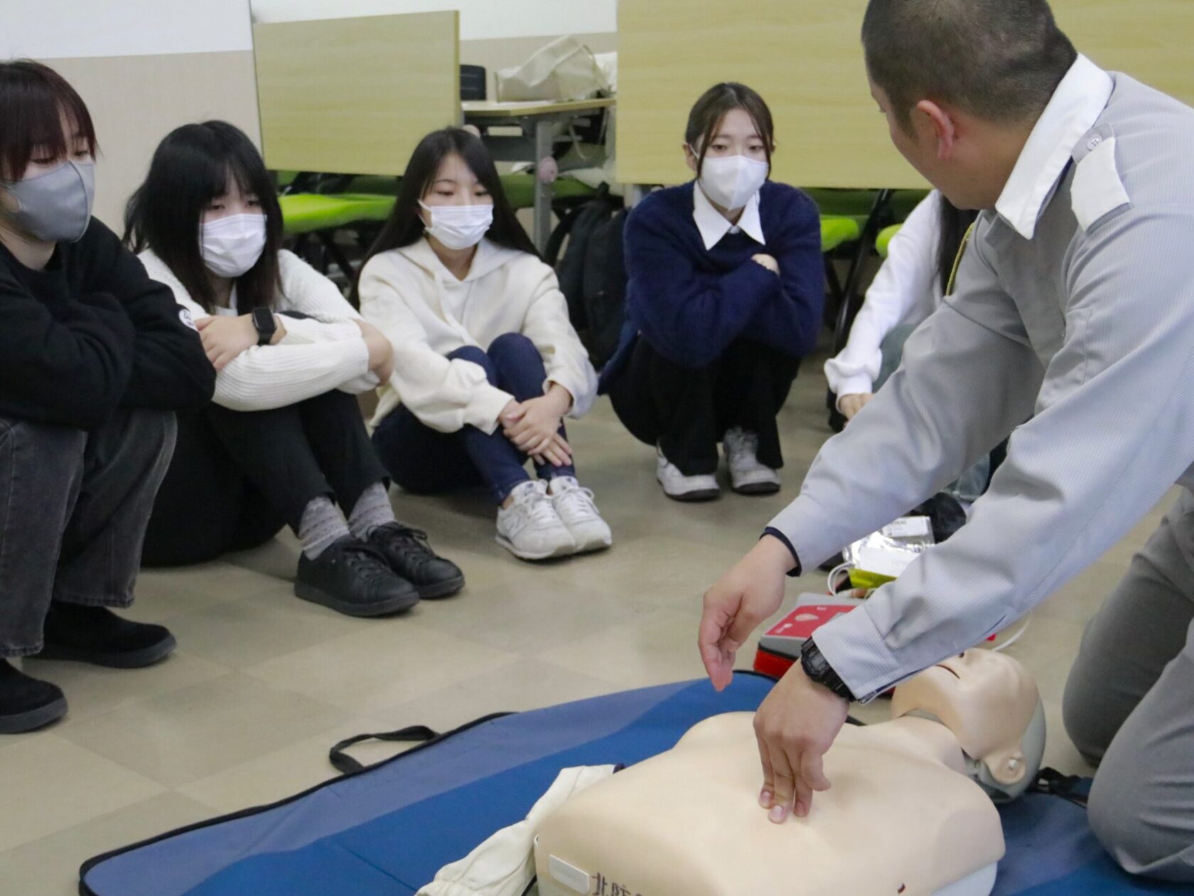 講習は、人形や練習用のAED(自動体外式除細動器)を用いた実技指導を中心に行われました。学生たちは、命に関わる状況を想定し、真剣な面持ちで一つひとつの手技を学びました。