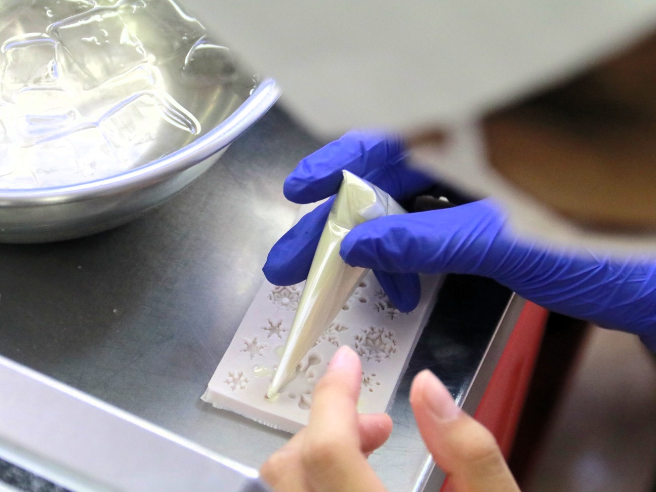 デザインが決まったら、いよいよ制作開始です。驚いたのは、その精密さ! 例えばチョコレートのテンパリング(温度調整)。学生たちは非接触型の温度計を使いわずかな温度変化も見逃しません。雪の結晶をかたどった繊細なパーツ作りなど、指先に全神経を集中させる作業が続きます。