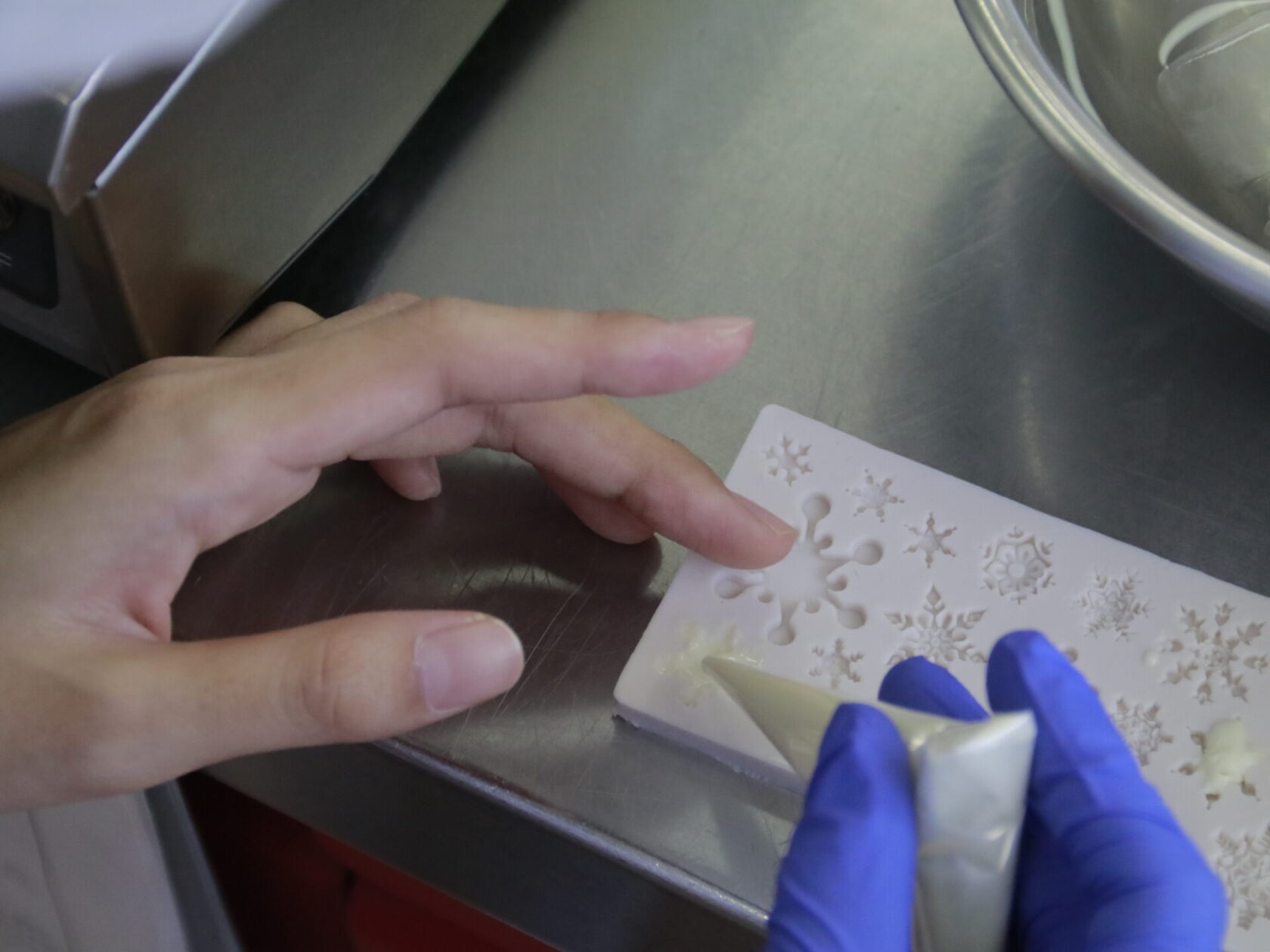 実習室では、プロが使う道具を使って、温度計を片手に慎重にチョコを練り上げていきます。一見難しそうに見えますが、先輩や先生が優しく教えるので安心してくださいね!