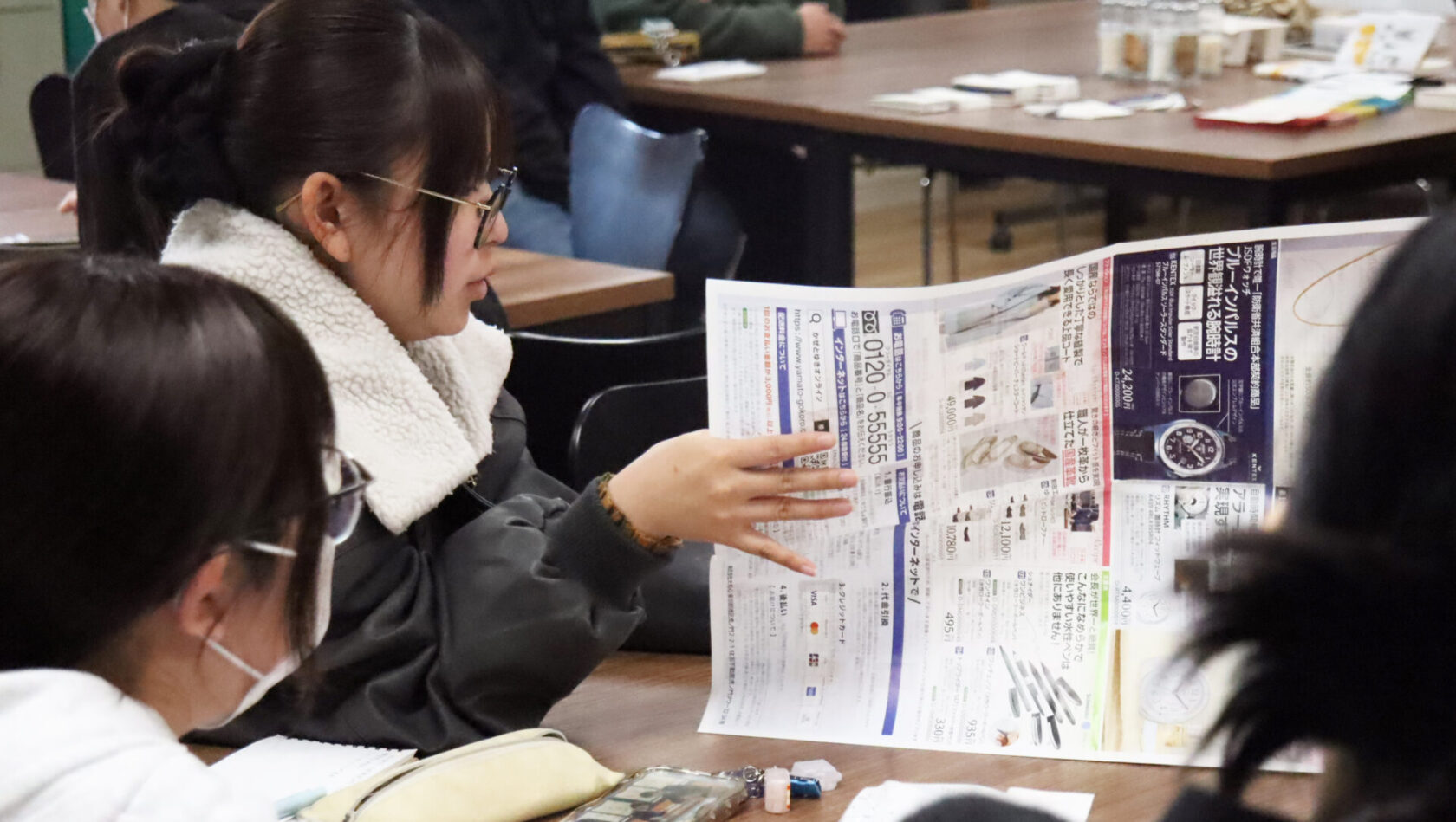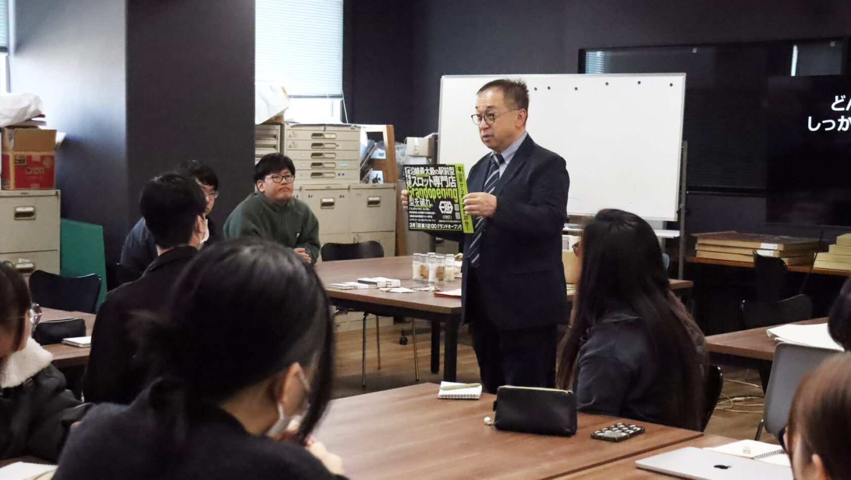 授業では、紙の種類や特殊な印刷など、学生たちの制作物の幅を広げる知識を教えて下さいました!さらに最近のチラシやカタログを事例に印刷のトレンドや加工方法をわかりやすくご説明いただき、学生たちもとても勉強になりました!