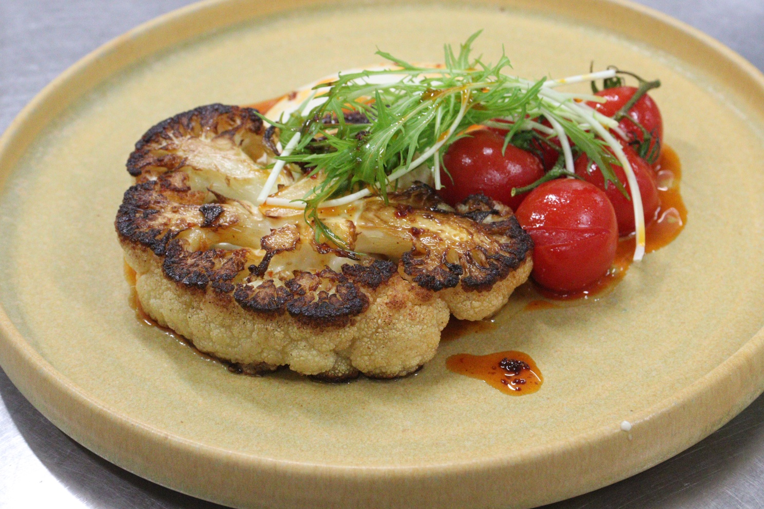 近年、海外からの旅行客(インバウンド)が増える中で、欠かせないのが「ベジタリアン」や「ヴィーガン」の方々への対応です。今回披露された『カリフラワーのステーキ 豆腐フムス・自家製ハリッサ』は、肉や魚を使わなくても満足感を得られる工夫が凝らされていました。