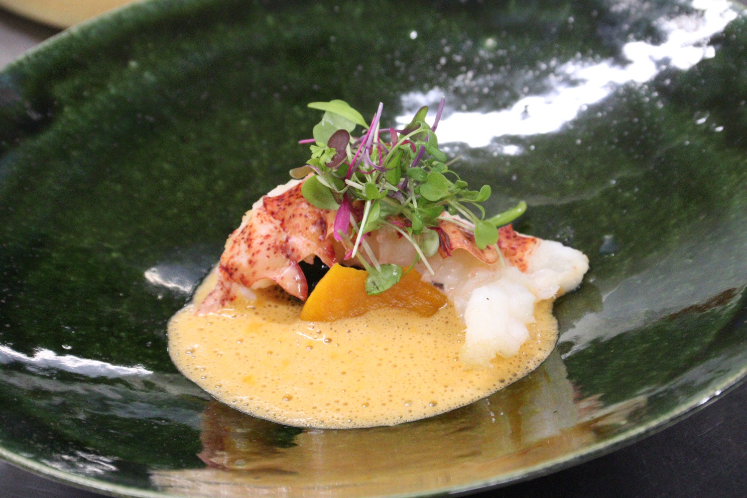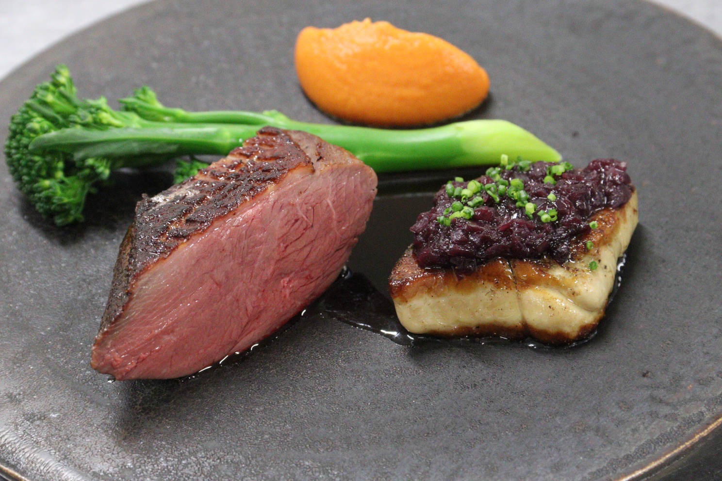 他にも、濃厚な香りが広がる『ロブスタービスク』や、完璧な火入れが施された『鴨胸肉の低温調理』など、ホテルクオリティの料理が次々と完成していきます。 低温調理(食材を真空状態にし、一定の温度でじっくり加熱する技法)によって、鮮やかなピンク色に仕上がった鴨肉の美しさは、まさに圧巻。学生たちは完成した料理の香りを確かめ、一滴のソース、一片のハーブの配置に至るまで、プロの盛り付けを熱心にメモしていました。
