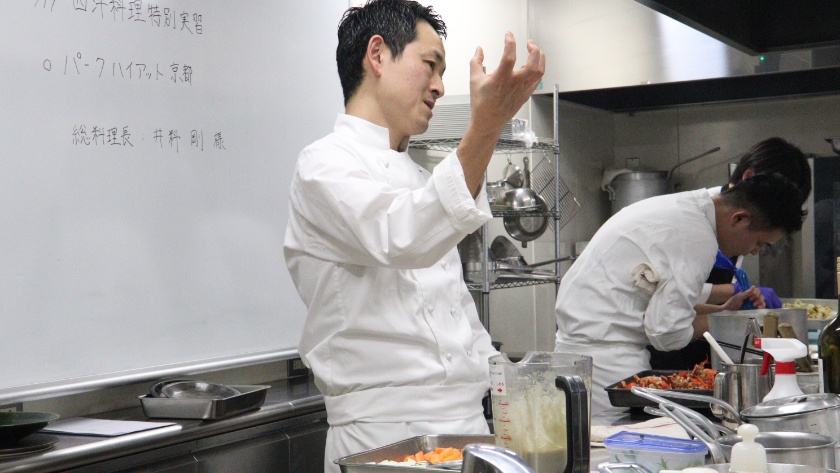 調理師を目指す学生たちにとって、この日は特別な一日となりました。京都の東山に位置するラグジュアリーホテル「パーク ハイアット 京都」より、総料理長の井料剛氏をお招きし、特別調理実習が開催されたのです。