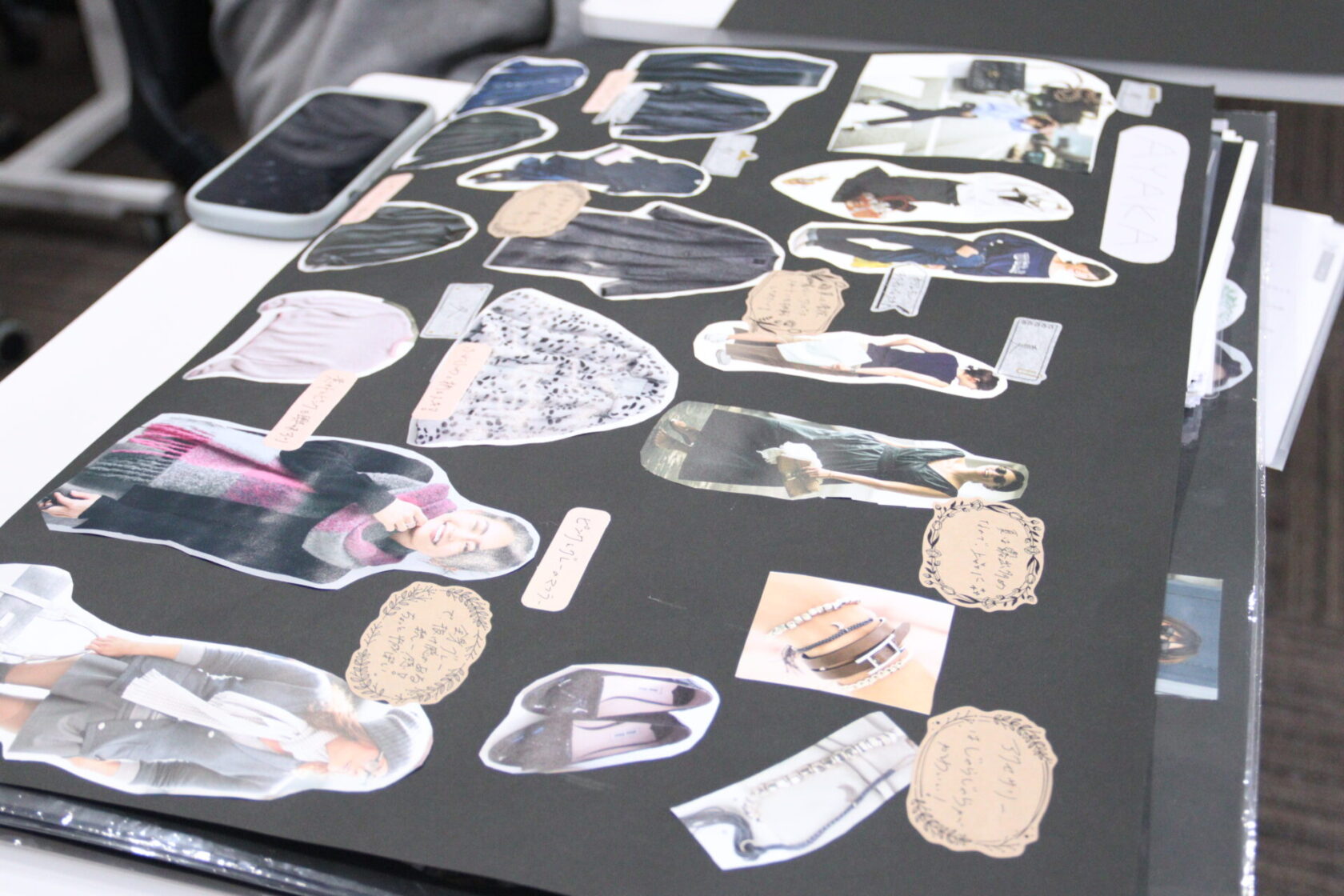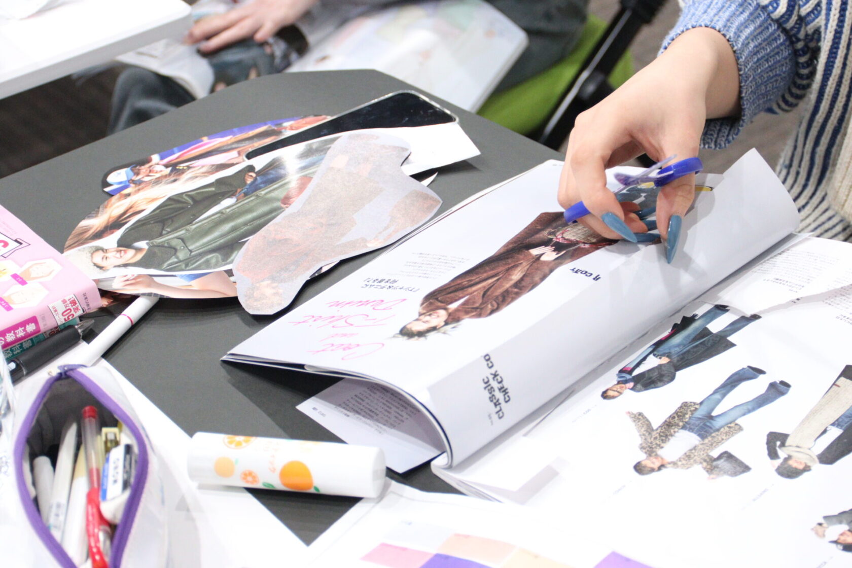 山積みのファッション誌から、診断結果にぴったりの服やバッグ、アクセサリーをピックアップ。画用紙の上に、理想のコーディネートを組み上げていきます。