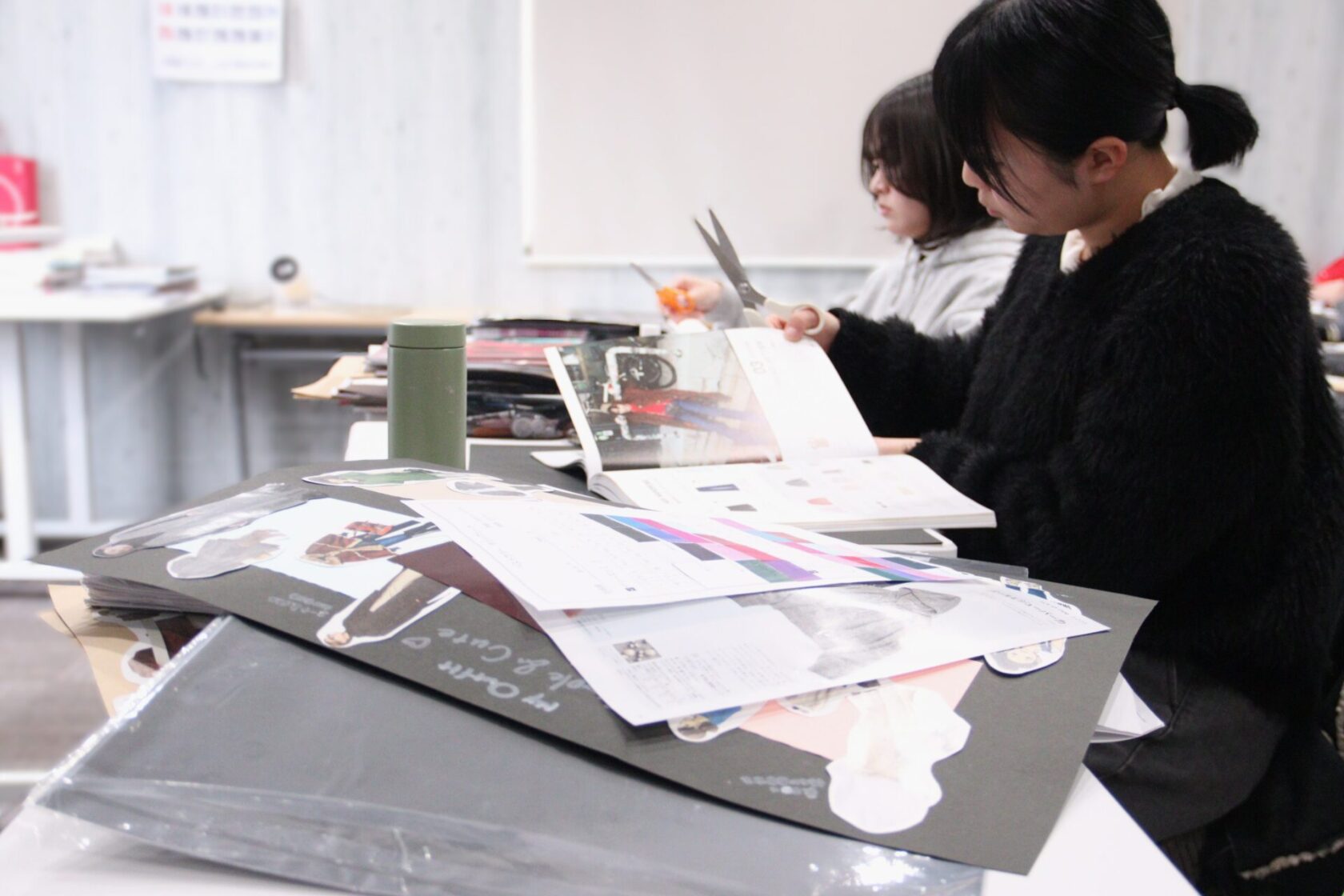 医療事務・クラーク学科の美容医療コース2年生の教室を覗くと、色とりどりの雑誌やカラーチャートに囲まれ、真剣な表情で作業に取り組む学生たちの姿がありました。