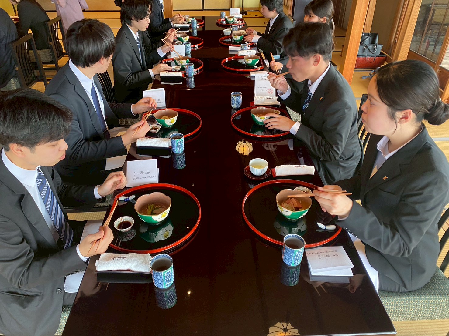 学生たちは、手入れの行き届いた美しい日本庭園を通り、厳かな和の空間へ。緊張した面持ちで席につきましたが、運ばれてくる繊細な料理の数々に、自然と笑みがこぼれます。 「器の温度、盛り付けの彩り、そして季節を感じる味……。教科書だけでは学べない、本物の仕事に感動しました」と語る学生も。和食の奥深さを、五感すべてで体験する貴重な時間となりました。