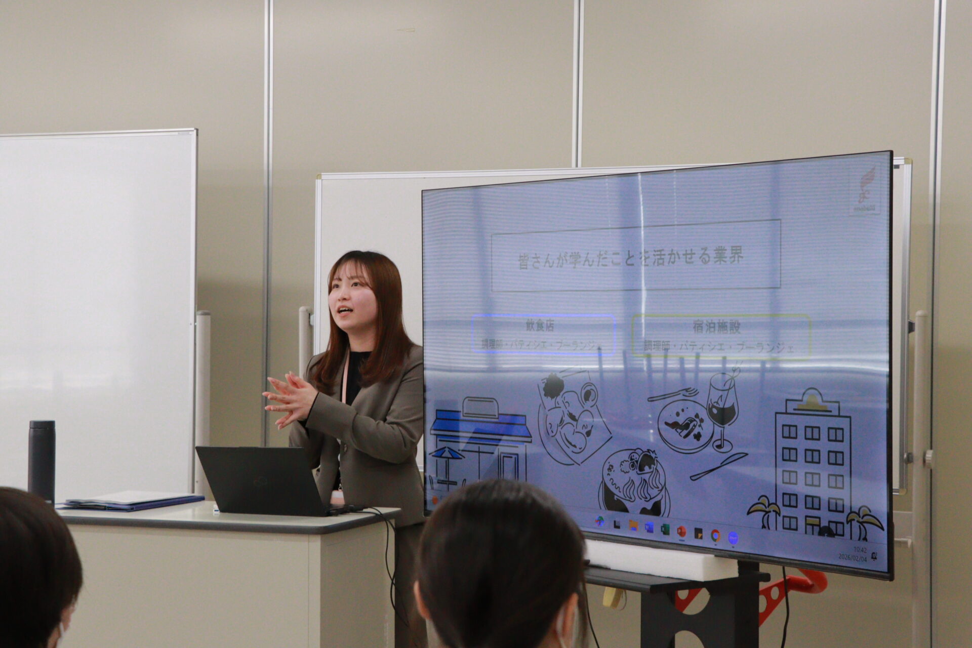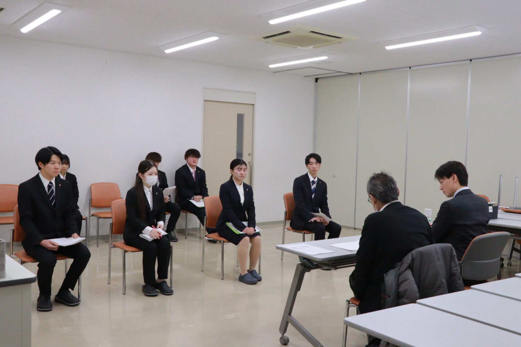 学生たちは、普段のコック服とは異なるスーツ姿で参加し、就職活動を見据えた実践的な学びに臨みました。