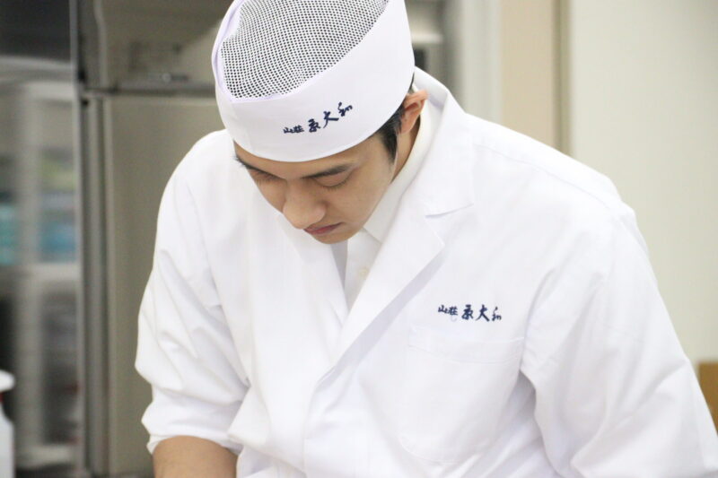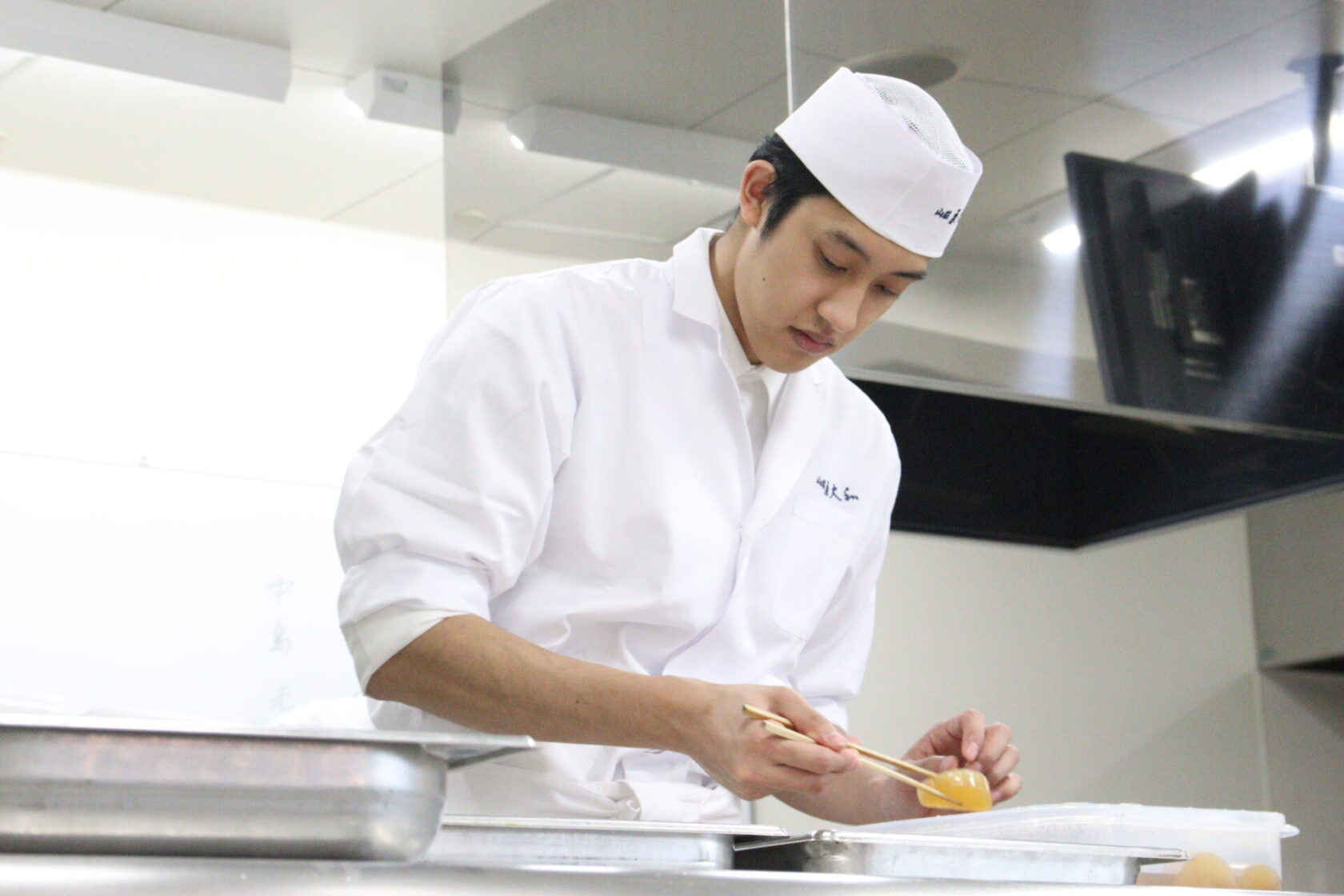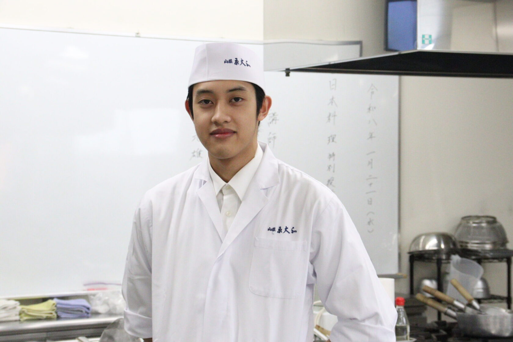 2025年4月に京都の老舗料亭『山荘 京大和』へ入社し、現在はプロの料理人として日々研鑽を積んでいる卒業生。先日、本校で行われた特別授業のサポート役として、久しぶりに母校へ戻ってきてくれました。