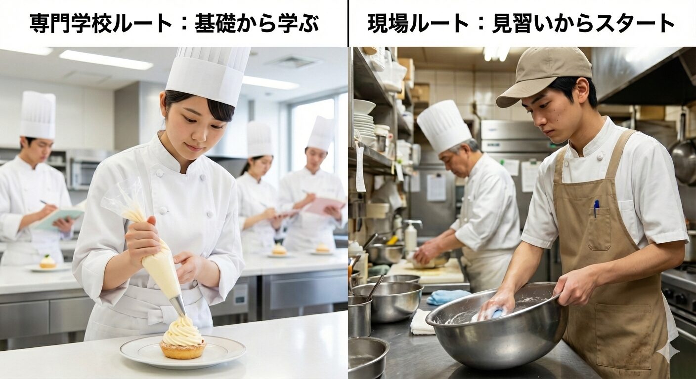 パティシエになるには、大きく分けて「専門学校に通うルート」と「未経験からお店に入るルート」の2つがあります。それぞれの特徴を見ていきましょう。